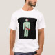 Black semi fitted mens tshirt with an illustrated picture of a traditional bathroom sign for zombies. The picture shows a male icon used on bathroom signs, only he is green with half of his skull missing exposing the brain, bullet holes in the chest, and his abdomen cut open with the guts pouring out. This funny zombie twist on the usual bathroom sign is the perfect tshirt for the stylish alternative zombie loving male with a sense of humour.