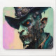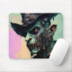 This striking artwork features a grotesque, zombie-like figure wearing a tattered hat adorned with gears. The character has vivid orange eyes and a grim expression, surrounded by a colourful, abstract background.