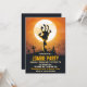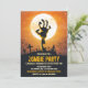 Set the mood for a Zombie party with a hand coming out of the grave in a cemetery with a orange sky, full moon, stars, and trees.