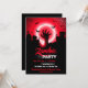 Set the mood for a Zombie party with a hand coming out of the grave in a cemetery with a red sky, full moon, bats, and a spiderweb.