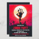Set the mood for a Zombie party with a hand coming out of the grave in a cemetery with a red sky, full moon, stars, and trees.
