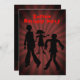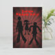 Zombie party invitations for a birthday or Halloween. Three walking dead zombies on the front with bright red, custom text for the type of party. On the back, customise a paragraph of text for all party information. Red grunge font is used and printed over black. The same starburst design decorates both sides.