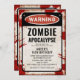 Vintage look invitation for a zombie outbreak-themed party with a rusty WARNING sign, blood stains, biohazard sign, and screws.