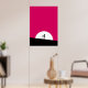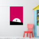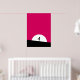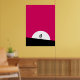 Poster with a cool zombie dude. Pink and black bold vibrant colour scheme. A zombie silhouette with arms outstretched on the hunt for brains. A big white moon illuminates from behind.