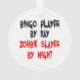 This funny text design features the phrase "Bingo Player by Day Zombie Slayer by Night" and is perfect for any bingo player who loves zombies.