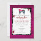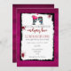 Wedding invitation with a cute illustration of a girl and guy zombie, totally in love reaching out towards each other with a pink heart flying above their heads. Cute and adorable but also creepy, hideous and fun! Set on a dark cerise coloured background. Red paint stains and paint splatters surround your wedding invitation lettering. Contains the words: "please join us as we celebrate our undying love", fitting for a zombie themed wedding invite.