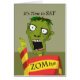 ZOMbye, It's time to say ZOMbye. Funny goodbye paper greeting card with an illustration of a zombie waving with a broken / twisted arm. Zombie with striped shirt, big bulging eyes, crooked teeth, and green shaded skin. Clipart thanks to Openclipart. Art, image, and verse copyright © Shoaff Ballanger Studios.
