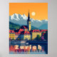 This stunning Zurich Switzerland shows a serene alpine landscape, colourful houses and a church steeple reflecting on a peaceful lake. Perfect for lovers of scenic mountain views, charming architecture and vibrant landscapes.